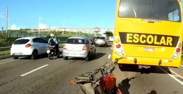 Um acidente envolvendo uma motocicleta, um ônibus escolar e um carro de passeio foi registrado no início da manhã desta terça-feira, 19, na Avenida Carybé, nas imediações do bairro de São Cristóvão, em Salvador. Uma ambulância do Serviço de Atendimento Móvel (Samu) foi acionada para realizar atendimento ao motociclista.
