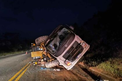 Um caminhão prancha que transportava uma motoniveladora tombou na noite de quarta-feira…