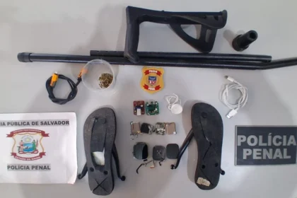 Idosa é flagrada tentando entrar com drogas e eletrônicos escondidos em muleta e chinelo na Cadeia Pública de Salvador