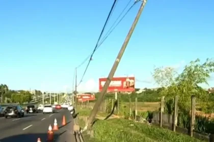 Poste fica pendurado pelos fios após batida de carro na Paralela